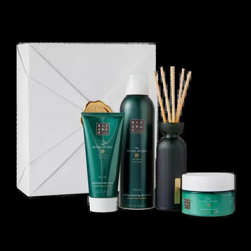Подарочный набор Rituals The Ritual Of Jing Size M Расслабление. Аромат. Роскошный уход. Устройте себе настоящий спа дома с The Ritual of Jing Calming Routine! Набор порадует вас натуральными ухаживающими средствами для кожи тела с успокаивающим ароматом лотоса и зизифуса (китайский финик). Содержит 200 мл геля для душа, 70 мл ароматизатора, 100 мл крема для тела 125 г скраба для тела. Упаковка в стиле оригами черпает вдохновение из японского дарования. В японской культуре способ упаковки подарка может быть таким же важным, как и сам подарок, который рассматривается как форма общения между дающим подарок и лицом, которое его получает.