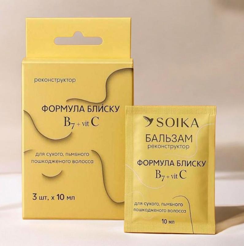 Набор Soika "Формула блеска" - шампунь, бальзам и крем-реконструктор Подарите волосам профессиональный уход и интенсивное сияние вместе с набором Soika "Формула блеска". Три средства обеспечивают полный ежедневный ритуал красоты: мягкое очищение, глубокое увлажнение, питание и укрепление. Волосы становятся гладкими, эластичными и блестящими по всей длине. Активные ингредиенты - Биотин (витамин B7) - усиливает структуру волос, улучшает прочность и уменьшает ломкость. - Аскорбил глюкозид (витамин C) - мощный антиоксидант, защищающий от внешних воздействий и поддерживающий естественный блеск. Преимущества набора - Полный комплекс ухода: очистка, питание и восстановление - Укрепление волос от корней до кончиков - Уменьшение ломкости, пушистости и сухости - Природный блеск, эластичность и ухоженный вид - Мягкость, послушание и легкая укладка - Профессиональный результат для любого типа волос 1. Шампунь-реконструктор Soika "Формула блеска" Очистка + укрепление + сияние Шампунь бережно удаляет загрязнение и избыток себума, не отягощая волосы. Благодаря биотину и стабильному витамину C средство укрепляет волосы, уменьшает ломкость и поддерживает естественный блеск. После использования волосы становятся легкими, свежими и послушными, а его природная структура выглядит здоровой и ухоженной. 2. Бальзам-реконструктор Soika "Формула блеска" Питание + разглаживание + эластичность Бальзам легко распределяется по волосам, глубоко увлажняет и помогает избавиться от ломкости. Благодаря биотину волосы становятся крепче, а витамин C защищает их от внешнего воздействия и усиливает блеск. Локоны становятся гладкими, послушными и мягкими на ощупь. Способ применения: Нанесите средство на вымытые влажные волосы, избегая корней. Оставьте на 5-7 минут и смойте теплой водой. 3. Крем-реконструктор Soika "Формула блеска" Легкий несмываемый уход + защита + антипушистость Крем имеет легкую текстуру, которая не отягощает волосы, обеспечивает увлажнение, разглаживание и защиту в течение дня. Он устраняет пушистость, делает волосы мягкими и блестящими, облегчает укладку. Биотин укрепляет волосы, а витамин C поддерживает сияние и защищает от отрицательного воздействия окружающей среды. Преимущества крема: - Интенсивное увлажнение и защита - Мягкость, гладкость и шелковистый блеск - Уменьшение пушистости - Легкая, невесомая текстура - Подходит для укладки и ежедневного ухода Способ применения: Возьмите 1-2 нажатия крема, распределите по длине на сухих или влажных волосах, избегая прикорневой зоны. Не смывать.