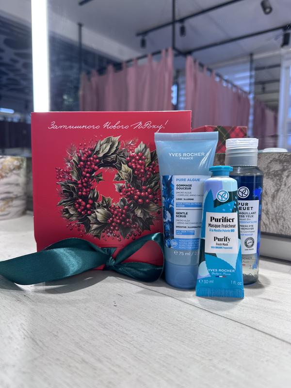 Набір yves rocher в новорічному пакуванні: засіб для зняття макіяжу, скраб для обличчя, ма...