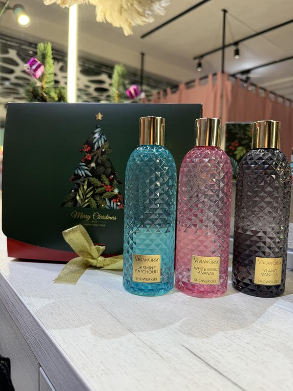 В наборі: - гель для душу Vivian Gray Жасмин - пачулі 300мл - гель для душу Vivian Gray Іланг-іланг - ваніль 300мл - гель для душу Vivian Gray Ананас - мускус 300мл