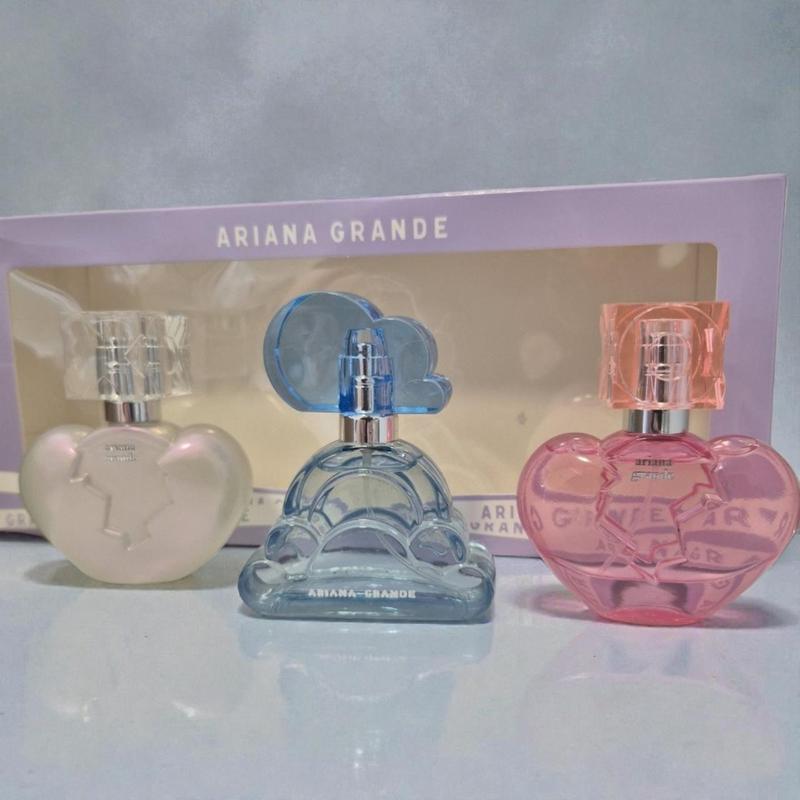 Яскравий набір Ariana Grande -- три повноцінні аромати у форматі 30 ml. У комплекті: - Cloud Eau de Parfum (30 ml) -- м'який гурманський аромат із нотами лаванди, груші, кокосу, ванілі та білого мускусу - R.E.M. Eau de Parfum (30 ml) -- космічна композиція з фігою, грушевим цвітом, сандалом і мускусом - Thank U Next Eau de Parfum (30 ml) -- фруктово‑солодкий аромат із нотами малини, кокосу, рожевого пелюстка та макаруна