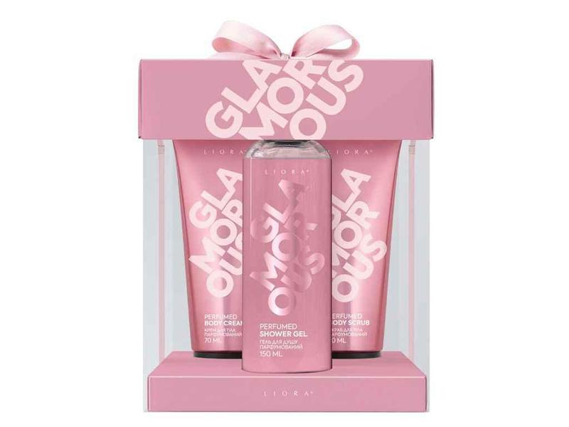 о складу набору входить: Гель для душу парфумований glamorous, 150 мл Крем для тіла парфумований glamorous , 70 мл Скраб для тіла парфумований glamorous, 70 мл Набір б’юті засобів забезпечують комплексний догляд за тілом, а вишуканий аромат засобів перетворить щоденні водні процедури на справжнє задоволення! Аромат: Іскристий, освіжаючий аромат гармонійно поєднує в собі яскраві квіткові акорди з відтінками бергамоту та витончені травянисто-пудрові ноти, які підкреслюють його жіночність та елегантність.
