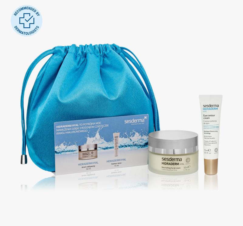 Sesderma Hidraderm Hyal Set подарунковий набір зі зволожуючим ефектом Набір містить: Sesderma Hidraderm Hyal поживний крем для зрілої шкіри 50 мл Sesderma Hidraderm Hyal крем для шкіри навколо очей зі зволожуючим ефектом 15 мл Поверніть своїй шкірі молодість Догляд, який проникає глибше, ніж просто на поверхню. Подарунковий набір зі зволожуючим ефектом Sesderma Hidraderm Hyal Set поєднує денний догляд за шкірою та цілеспрямований догляд за шкірою навколо очей, натхненний успішною колекцією. Насолоджуйтеся доглядом, який заповнює зморшки, заспокоює та повертає вашій шкірі молодий вигляд. HIDRADERM HYAL Крем-контур для шкіри навколо очей: розгладжує мімічні зморшки та мінімізує ознаки втоми шкіри 3 типи гіалуронової кислоти та 2 типи ретиноїдів зменшують набряки під очима надає шкірі навколо очей денну дозу зволоження вітамін A глибоко омолоджує шкіру інкапсульовані ліпосоми дозволяють речовинам проникати на різні рівні шкіри та максимально підсилюють їхню дію HIDRADERM HYAL Зволожувальний крем: максимально зволожує шкіру завдяки 3 типам гіалуронової кислоти, посилених колагеном, керамідами та оліями заповнює поверхневі зморшки та забезпечує шкірі максимальний комфорт забезпечує шкірі живлення навіть у найглибших шарах