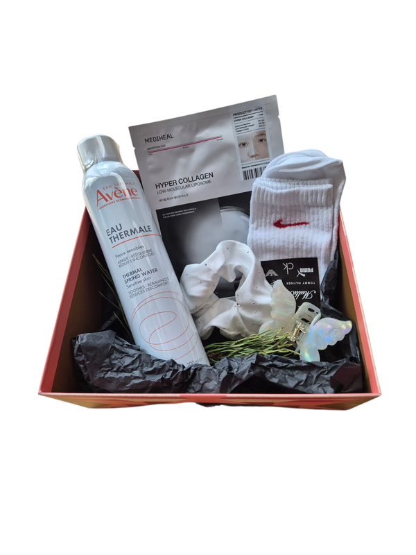 1. Термальная вода Avène, 300 мл. 2. Колагенова маска для обличчя, 1 шт. 3. Резинка с камушками, белая, 1 шт. 4. Капилка-бабочка, молочный, 1 шт. 5. Носки 36-40, белые, 1 шт. 6. Подарочная упаковка на выбор. 7. Открытка, 1 шт. на выбор.