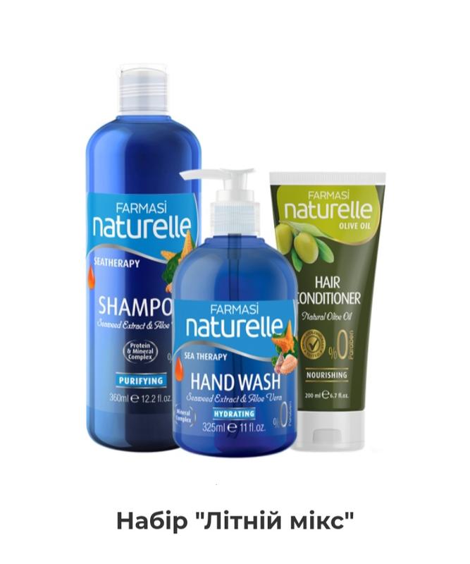 Опис Товару До набору входити: Кондиціонер для волосся Naturelle Olive Oil. Шампунь Naturelle Sea Therapy, 360 мл. Мило для рук Naturelle Sea Therapy, 325 мл.