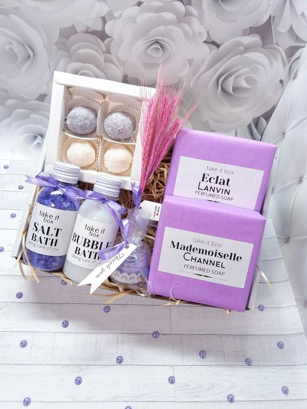 1. Парфюмоване мило "Eclat" Lanvin (наша ручна робота) 2. Парфюмоване мило "Coco Mademoiselle" Channel (наша ручна робота) 3. Цукровий скраб для тіла з ароматом винограду і кокосові у вигляді цукерок (наша ручна робота) 4. Піна для ванни з ароматом піна-колада 175мл (Польща) 5. Сіль для ванни з ароматом лаванди 180г (Польща) 6. Свічка з ароматом вишневої кісточки (наша ручна робота) 7. Букетик сухоцвітів (наша ручна робота) 8. Подарункова коробка з наповнювачем і стрічкою У нашому інтернет магазині великий асортимент унікальних подарункових боксів ручної роботи - Оригінальні і корисні подарунки - Пайові подарунки - Подарункові бокси на День Народження - Бокси для чоловіків - Новорічні бокси - Секретний Санта - Бокси до дня Св. Валентина - Бокси на 8 березня - Індивідуальні подарункові бокси - Широкий асортимент - Приємні ціни - Індивідуальний підхід до кожного клієнта, врахуємо всі ваші побажання - Доставка по всій території України ( Нова Пошта, УкрПошта, Justin)