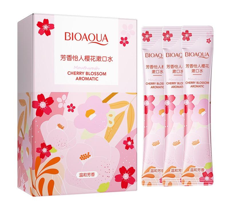 Ополаскиватель для полости рта с экстрактом вишни Bioaqua Cherry Blossom Aromatic 1*10 мл Ополаскиватель для рта с ароматом вишни убирает налет, освежает дыхание, предупреждает кариес. Ополаскиватель удобно брать с собой. Он мягко очищает полость рта и удаляет зубной налет, дарит свежее дыхание и удаляет бактерии. Преимущества ополаскивателя: - Свежее дыхание. - Профилактика кариеса. - Профилактика зубного камня. - Избавляет от налета. - Оказывает антибактериальное действие. - Устраняет неприятный запах. Способ применения: раскройте пакетик, вылейте содержимое в рот, прополощите в течение примерно 1 минуты, выплюньте. Использовать после еды, напитков или чистки зубов. Продаются набором и поштучно