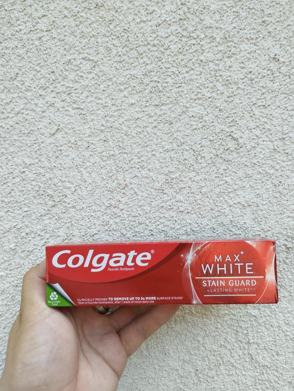 🦷 Зубна паста Colgate Max White Stain Guard 75 мл — захист від плям, карієсу та нальоту для білосніжної усмішки ✨ До 100% менше плям | Природна білизна | Свіже дихання Хочете зберегти сяючу білизну зубів надовго? Спробуйте Colgate Max White Stain Guard — відбілюючу зубну пасту, яка видаляє до 100% поверхневих плям, відновлює природну білизну емалі та запобігає повторному утворенню забруднень. Формула з активними компонентами забезпечує захист від карієсу, усуває зубний наліт, а також надає відчуття свіжості на цілий день. Ідеальний вибір для щоденного використання та тривалої підтримки білосніжної усмішки! * * * ✅ Переваги Colgate Max White Stain Guard: - 🦷 Видаляє до 100% поверхневих плям (кава, чай, нікотин тощо) - ⚪ Відновлює природну білизну зубів - 🛡️ Запобігає повторному появленню плям - ✅ Захист від карієсу завдяки фториду - 🌿 Освіжає дихання та бореться з бактеріями - 📅 Підходить для щоденного використання * * * 📦 Об’єм: 75 мл 🦷 Формула: відбілююча, з фтором 🌍 Тип пасти: проти плям, для сяючої білизни 🧪 Вміст фтору: 1450 ppm 💡 Порада: для найкращого ефекту використовуйте 2 рази на день у комплексі зі щіткою середньої жорсткості та зубною ниткою. Уникайте фарбувальних напоїв (кава, чай) після чищення. * * * 🔸 Colgate Max White Stain Guard — щоденний догляд для бездоганної усмішки!