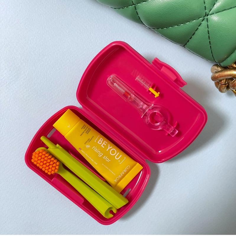 У набір входить 🔸Розкладна зубна щітка 5460 ультра софт 🔸 Освітлююча зубна паста Curaprox Be You - 10 мл 🔸 Тримач для йоршика та йоршика 2 шт 🔸 Зручний футляр