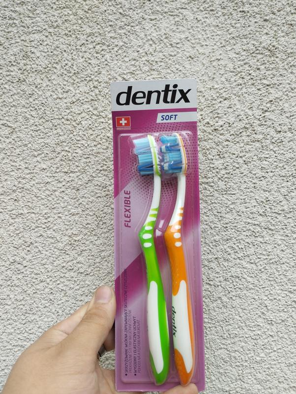 Набір зубних щіток Dentix Flexible Soft 2 шт – м’яке та ефективне очищення зубів і ясен Набір зубних щіток Dentix Flexible Soft (2 шт) – це ідеальне рішення для щоденної гігієни ротової порожнини. Завдяки м’якій щетині та гнучкому корпусу, щітки дбайливо очищають зуби, не травмуючи ясна. Спеціальна конструкція з перехресними щетинками різної довжини дозволяє проникати навіть у важкодоступні ділянки між зубами. Щітки мають ергономічну ручку з нековзним покриттям, а на зворотній стороні головки – гумову поверхню для очищення язика та внутрішньої сторони щік, що забезпечує повноцінний догляд за всією ротовою порожниною. * * * Основні переваги Dentix Flexible Soft: - М’які щетинки – не травмують ясна, підходять для чутливих зубів - Гнучка головка щітки – знижує тиск, запобігає мікротравмам - Щетина різної довжини, розташована навхрест – ефективно очищає проміжки між зубами - Гумова ручка – зручна, не ковзає в руці - Гумова накладка для чищення язика та щік - Упаковка містить 2 щітки різних кольорів - Ідеальні для щоденного використання вдома або в дорозі