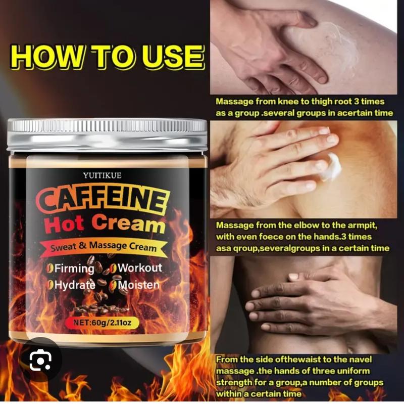 разогревающий крем Yuitikue Caffeine Hot Cream, который позиционируется как средство для массажа и усиления потоотделения во время тренировок. Назначение: Крем предназначен для использования во время физических нагрузок, способствуя разогреву мышц и усилению потоотделения. Эффекты: Заявляется о таких эффектах, как укрепление кожи (Firming), увлажнение (Hydrate, Moisten) и помощь в тренировках (Workout). Ингредиенты: Содержит кофеин, который, как считается, способствует расщеплению жировых клеток и улучшению микроциркуляции. Применение: Может использоваться на различных участках тела, включая живот, бедра, ноги, руки и ягодицы. Объем: Объем продукта составляет 100 г (3,52 унции).