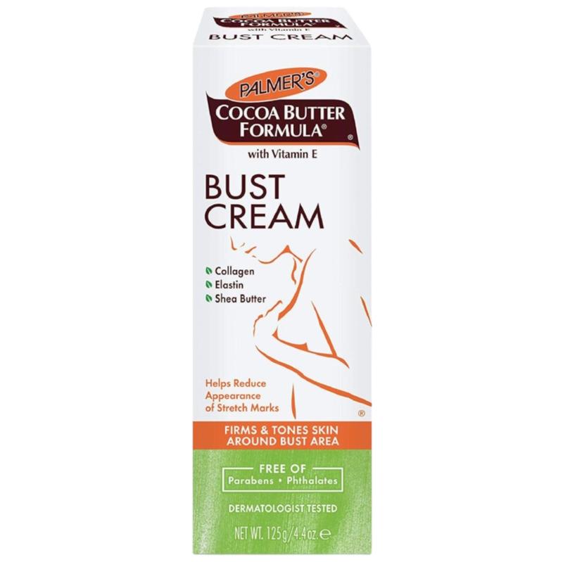 Укрепляющий крем для бюста Palmers Cocoa Butter Formula Bust Cream предназначен для ухода за нежной кожей бюста во время и после беременности. Крем интенсивно увлажняет, питает и подтягивает кожу, предотвращает появление растяжек и провисаний, выравнивает тон, сохраняет мягкость и нежность кожи. Крем также поможет избежать сухости и потери эластичности кожи при похудении, восстанавливает плотность и упругость тургора. Крем быстро впитывается в кожу, не оставляет липкости или жирного налета, имеет мягкий, не раздражающий аромат шоколада. Специальный запатентованный комплекс Bio C-Elaste, содержащий гидролизованный коллаген, эластин, экстракт центеллы азиатского, арганового и миндального масла, придает коже невероятную эластичность, которая поможет избежать появления растяжек, сухости и шелушений кожи, сделает дерму более плотной и сильной, укрепит стенки сосудов, улучшит микроциркуляцию крови. Витамин E борется с сухостью кожи, поддерживая водно-липидный баланс, оказывает успокаивающее действие, снимает воспаление, раздражение и шелушение кожи. Масла какао, ши, протеиновый комплекс сои и олиго- пептидный комплекс сохраняют молодость и плотность кожи, тонизируют, питают, восстанавливают, увлажняют ее. Не содержит парабены, фталаты. Гипоаллергенный. Не тестируется на животных. Вага нетто: 125 г Применение: нанести крем массирующими движениями на область бюста. Применять два раза в день.