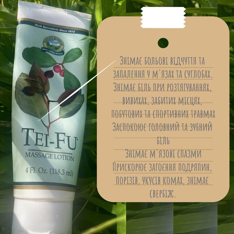 Формула лосьйону Tei-Fu від Nature Sunshine включає кілька видів масел: евкаліптове; гвоздичне; зимолюбки; олія, отримана з DL-камфорних пластівців. А також L-ментолу та кремоподібний сік алое віра. Завдяки цим активним речовинам Tei-Fu, що глибоко проникають у тканини, досягається стимулювання обмінних процесів, покращення кровообігу. 👉🏻Тей ФУ від Nature's Sunshine полегшує суглобові та м'язові болі, у тому числі при артриті та радикуліті. 👉🏻Масаж з Тей фу знімає головний біль, благотворно впливає на нервову систему, знімає емоційну напругу. 👉🏻При забитих місцях і розтягуваннях зв'язів масажний крем Тей Фу не тільки полегшує стан, а й прискорює загоєння. 👉🏻Крем Тей фу очищує шкіру від вугрової висипки, загоює дрібні порізи та ранки та допомагає при опіках, знімає свербіж від укусу комахами, зволожує, надає шкірі пружності. Роздрібна ціна від NSP складає 21,04$. Дисконтна ціна на 30% нижча – за подробицями в дірект😉