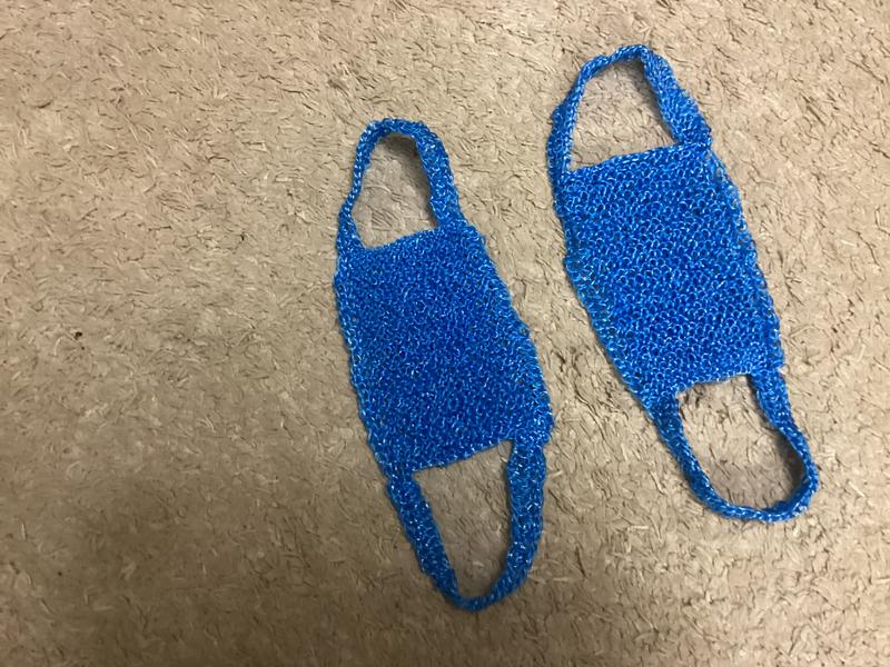 Мочалка связана спицами из полипропиленовых ниток. Она жесткая, хорошо мылится, быстро сохнет. Размер 14»20. Срок эксплуатации неограниченный.