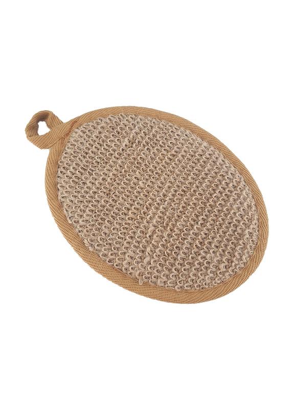 Мочалка для тела овальная с ремешком для руки и петлей для крючка, внутри тонкий поролон. С одной стороны трикотажное полотно с другой плетение из сизаля. Размер 19*10см