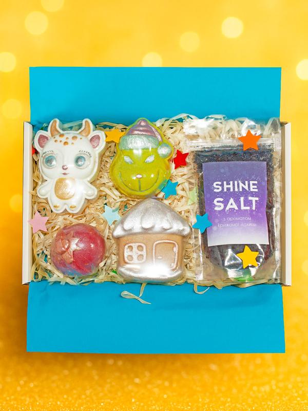 Подарочный набор для ванны -- яркое новогоднее сочетание ароматов, сияния и зимнего настроения. Внутри -- праздничная коллекция бомбочек и мерцающей соли, которые превращают купание в тёплый зимний ритуал. Каждая бомбочка шипит, наполняет воду цветами, мягкой пеной и сказочными ароматами. Милое оленёнок, Гринч, рождественский домик и новогодний шарик вместе создают атмосферу радости, волшебства и домашнего уюта. В наборе: 1. Бомбочка «Оленёнок» 3D -- нежное светлое растворение и аромат абрикосового йогурта, 110 г 2. Бомбочка «Гринч» 3D -- ярко-зелёное мерцание и аромат яблочной жвачки, 105 г 3. Бомбочка «Рождественский домик» 3D -- аромат праздничного печенья и мягкое шипучее растворение, 110 г 4. Бомбочка «Новогодний шарик» -- красно-розовый оттенок в воде и аромат зимней вишни, 90 г 5. Шиммер-соль «Shine Salt» -- мерцающие кристаллы и аромат на выбор (6 видов), 200 г Преимущества набора: • яркое шипучее и ароматное растворение; • натуральные ингредиенты и бережный уход за кожей; • изготовлено вручную с любовью; • праздничная упаковка, полностью готовая к дарению; • создаёт настоящий новогодний настрой. Кому подойдёт: Для ребёнка, девушки, парня, подруги, жены или коллеги. Набор дарит эмоции праздника с первой секунды открытия. Срок годности: 160-250 дней. Подходит для детей от 3 лет.