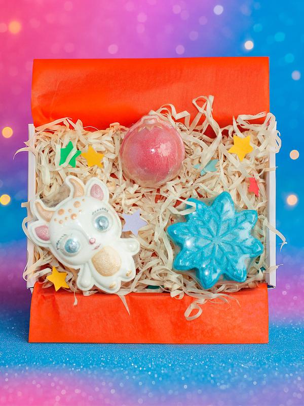 Подарочный набор бомбочек -- тёплая зимняя сказка, которая оживает прямо в ванной. Этот праздничный набор дарит атмосферу уюта, радости и настоящего волшебства новогодних вечеров. Каждая бомбочка шипит и наполняет воду нежной пеной, превращая купание в маленький праздник. Милое оленёнок, сияющая снежинка и новогодний шарик создают настроение, которое хочется сохранить надолго. В наборе: 1. Бомбочка «Оленёнок» 3D -- нежное мерцающее растворение и аромат абрикосового йогурта, 110 г 2. Бомбочка «Сияющая Снежинка» 3D -- лёгкое голубое сияние в воде и аромат голубики, 100 г 3. Бомбочка «Новогодний Шар» 3D -- праздничный красно-розовый цвет в воде и аромат зимней вишни, 90 г 4. Подарочная упаковка + открытка на выбор (цвет бумаги и ленты может отличаться) Преимущества набора: • яркое шипучее растворение с волшебными переливами в воде; • натуральный состав и приятный уход за кожей; • изготовлено вручную с любовью; • праздничная упаковка, готовая к вручению; • дарит тёплые эмоции и зимнее настроение. Кому подарить: Идеальный подарок для девушки, ребёнка, подруги, жены, парня или коллеги. Набор сразу создаёт атмосферу праздника и вызывает искреннюю улыбку. Срок годности: от 160 до 250 дней. Подходит для детей от 3 лет.