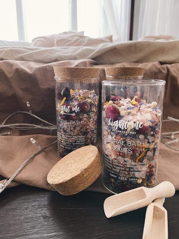 Флористическая соль для ванны Соль для ванны можно купить в любом магазине, но эта - особенная. Мы делаем ее вручную - смешивая соль для ванны, эфирные масла ( жасмин, иланг-иланг, сандал) и сушеные цветы (бутоны роз, лепестки василька, календулы, лаванда) для расслабления - и получаем спа коктейль у вас дома. Провести красивый спа ритуал дома теперь гораздо проще, достаточно использовать нашу флористическую соль. Как это работает? Растворите 2-3 ложки соли и принимайте ванну. Ванна с гималайской соль помогает расслабиться, избавиться от токсинов, накопленных в организме, очистить и смягчить кожу. А причиняй аромат эфирных масел и цветов поможет поднять настроение. Даже если у вас нет ванны, всегда можно принять ванну для ног☺️ В подарок к соли, кладём деревянную ложечку для того, чтобы вам было удобно ее насыпать. Стакан с пробковой крышкой, после использования соли, можно вымыть и использовать для ватных дисков или палочек.
