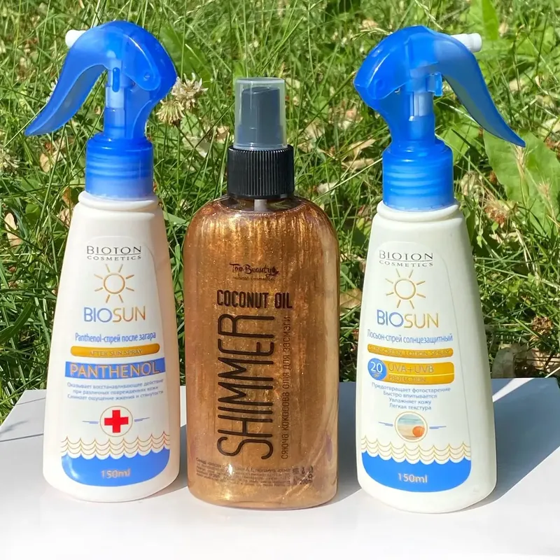 Пусть каждая ваша встреча с солнечными лучами будет приятной и безопасной! Не забывайте о меры предосторожности и непременно пользуйтесь солнцезащитными средствами. А этот набор Вам у этому поможет. Состав набора: 1. Солнцезащитный лосьон-спрей SPF 20 Bioton Cosmetics BioSun 150 мл. Солнцезащитный лосьон-спрей Bioton Cosmetics BioSun обладает средней степенью защиты SPF 20 и водостойкой формулой с фильтрами UVA и UVB. 2. Кокосова масло для загара с шиммером Top Beauty Shimmer Coconut Oil 200 мл. Шиммер - самый популярный продукт этим летом! Используя его Вы приобретете красивый ровный бронзовый загар, мерцающие частицы в составе подарят потрясающее сияние кожи, и придадут телу стройности. Имеет фактор защиты от УФ-излучения SPF 15 Эффект потрясающий! 3. Пантенол-спрей после загара Bioton Cosmetics BioSun 150мл. Его сбалансированная формула разработана на основе Д-пантенола, персикового масла, экстракта алоэ и ментола. Благодаря богатому составу средство наполняет кожу питательной влагой, и приятно охлаждает после пребывания на солнце и купания в соленой или пресной воде. Доставка: Предоплата на карту. Доставка Новой или Укр-почтой.