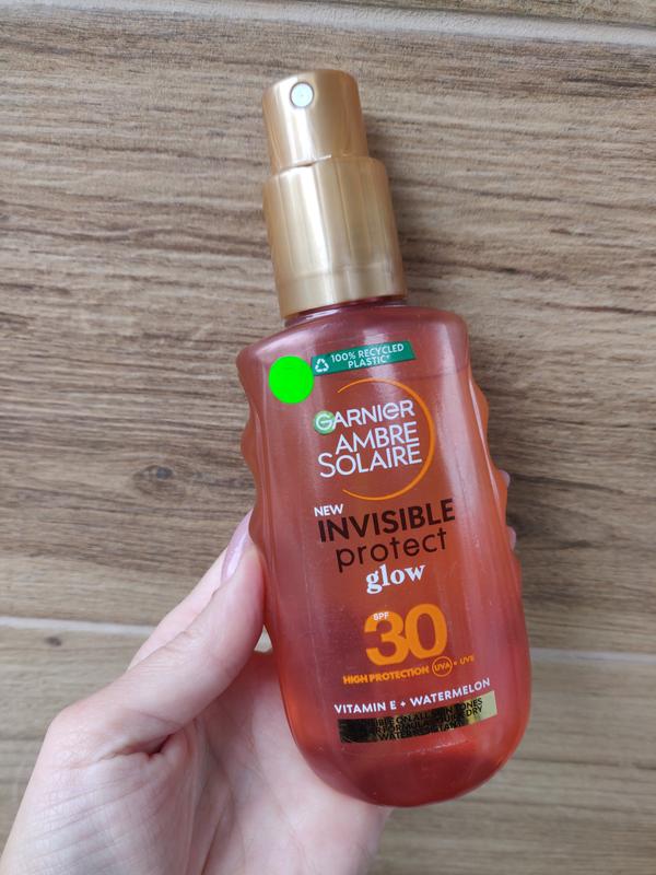Garnier Ambre Solaire Invisible Protect Glow SPF30 Spray Солнцезащитный водостойкий спрей для кожи тела и лица "Невидимая Защита", высокая степень защиты SPF30 дата до 11.25 - на море поехать не удалось(( не использовался двухфазный спрей для лица, спрей для тела Назначение: для сияния, питания, защита от солнца, увлажнение Тип кожи: все типы Ингредиенты: витамин e, глицерин, арбуз, спирт, фруктовые экстракты, цитронелла Особенность: не тестировалась на животных Степень защиты: spf 30 Специальные сертификаты: cruelty free Формула средства: водостойкая, с глицерином