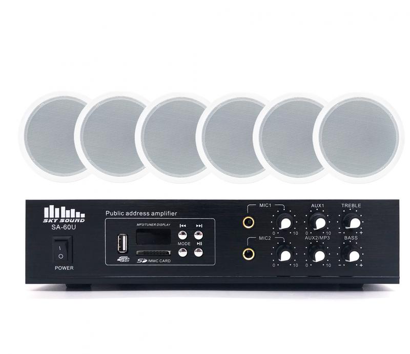Акустичний комплект SKY SOUND CSB-3106 складається з 6-ти стельових динаміків Sky Sound S-2631 та одного підсилювача потужності Sky Sound SA-60U BLACK. Комплект звукового обладнання призначений для озвучування невеликих приміщень, кафе, салонів краси чи офісів тощо. (До 60 кв.м.). Широкосмуговий стельовий динамік SKY SOUND S-2631 (Білий) призначений для використання в системах трансляції та оповіщення, фонового озвучування. Недорога та якісна акустична система S-2631 користується високим попитом у інсталяторів та кінцевих споживачів завдяки високим акустичним характеристикам, простоті в установці, сучасному дизайну та розумній ціні. Технічні характеристики SKY SOUND S-2631TW - Потужність: 10-30 Вт (відведення трансформатора) - Діапазон відтворюваних частот: 40-20000 Гц - Чутливість: 88 дБ - Опір: 8 Oм - Тансформатор: 100 В - Вологозахист: є - Матеріал: Пластик, металеві грати - Колір: Білий - Виконання: Для встановлення у приміщеннях - Габарити: D180*65 мм - Настановні розміри: D150*60 мм - Вага: 0,8 кг Трансляційний підсилювач Sky Sound SA-60U BLACK потужністю 60 Вт, призначений для створення невеликих систем трансляції та озвучування з сумарною потужністю акустики не більше 60-ти Ватт. Це можуть бути невеликі торгові підприємства, кафе та ресторани, офіси, АЗС спортивні майданчики та інше. Технічні характеристики Sky Sound SA-60U BLACK - Вихідна потужність: 60 Вт - Вихідна напруга/опір: 100В/70В та вихід 4-16 Ом - Селектор зон: 1 зона (60 Вт/100 В) - Вбудований джерело звуку: Bluetooth, FM-тюнер, MP3/WMA програвач USB/SD/MMC Card - Мікрофонні входи: 2 (JACK 1/4") - Лінійні входи: 2 (RCA стерео) - Вихідний сигнал (Напруга/Опір): 100В/70В та вихід 4-16 Ом - Діапазон відтворюваних частот: 40 Гц — 18 кГц - Захист по виходу: перевантаження, КЗ - Потужність: 60 Вт - Напруга живлення: АС 220-240 В, 50 Гц - Робоча температура: +10 ° C - +35 ° C - Колір: чорний - Габаритні розміри: 282 x 220 x 66 мм - Вага: 2.4 кг Вартість комплекту на 5% дешевша за вартість включених до нього товарів окремо.