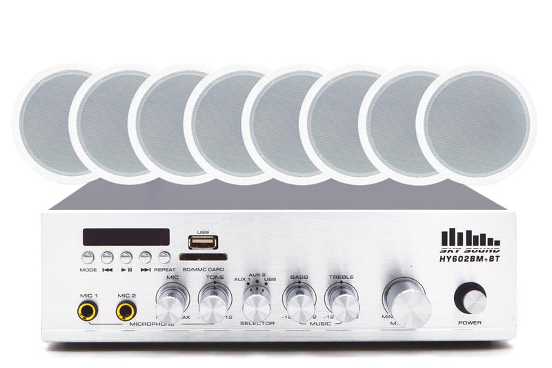 Акустичний комплект SKY SOUND CSY-3008 складається з 8-х стельових динаміків SKY SOUND S-2630W і одного підсилювача потужності SKY SOUND HY-602MB + BT STEREO. Комплект системи озвучування призначений для невеликих приміщень, кафе, салонів краси або офісів і т.д. (До 80 кв.м.). SKY SOUND HY-602MB + BT - двоканальний підсилювач потужності для підключення до низькоомним акустичним система трансляції фонового озвучування і мовного оповіщення. Функціональні особливості: - 2 стерео каналу потужністю по 60 Вт; - MP3/WMA програвач USB/SD/MMC Card; - Бездротова передача сигналу з допомогою Bluetooth; - Двосмуговий еквалайзер; Технічні характеристики SKY SOUND HY602MB + BT: - Вихідна потужність: 2 * 60 Вт - Вихідна напруга / опір: 4-16 Ом - Вбудований джерело звуку: Bluetooth, MP3 / WMA програвач USB / SD / MMC Card - Мікрофонні входи: 1 (JACK 1/4 ") - Лінійні входи: 2 (RCA стерео) - Лінійні виходи: 1 (RCA стерео) - Діапазон відтворюваних частот: 20 Гц - 20000 Гц - Signal to noise ratio: > 90 Дб - Захист по виходу: перевантаження, КЗ - Напруга живлення: АС 220-240 В, 50 Гц - Робоча температура: + 5 ° C - + 40 ° C - Додатково: ДУ, виносна BT антена - Колір корпусу: срібло - Габаритні розміри: 220 * 220 * 90 мм - Вага: 2.5 кг SKY SOUND S-2630W - широкосмуговий динамік, оснащений високоякісним 5-дюймовим вуфером потужністю 6 Вт. Корпус виконаний з ABS пластику і металевої захисної решітки. Гучномовець простий в установці завдяки простий монтажної системі з двома зажимами. Технічні характеристики: - Потужність: 6-10 Вт - Діапазон відтворюваних частот: 90-16000 Гц - Чутливість: 89 дБ - Опір: 8 Ом - Тансформатор: немає - Вологозахист: немає - Матеріал: Пластик, металева решітка - Колір: білий - Виконання: Для установки в приміщеннях - Габарити: D185*45 мм - Установчі розміри: D160*45 мм - Вага: 0,4 кг *Вартість комплекту на 5% дешевше вартості включених в нього товарів окремо.