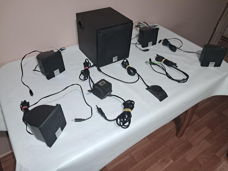 Акустика Creative inspire 4+1. В хорошем состоянии. Все работает. Звук хорош. Ничего не скрипит и не скрипит. Есть немного мелких недостатков, как немного прорванная декоративная ткань и небольшие сколы на сабвуфере.