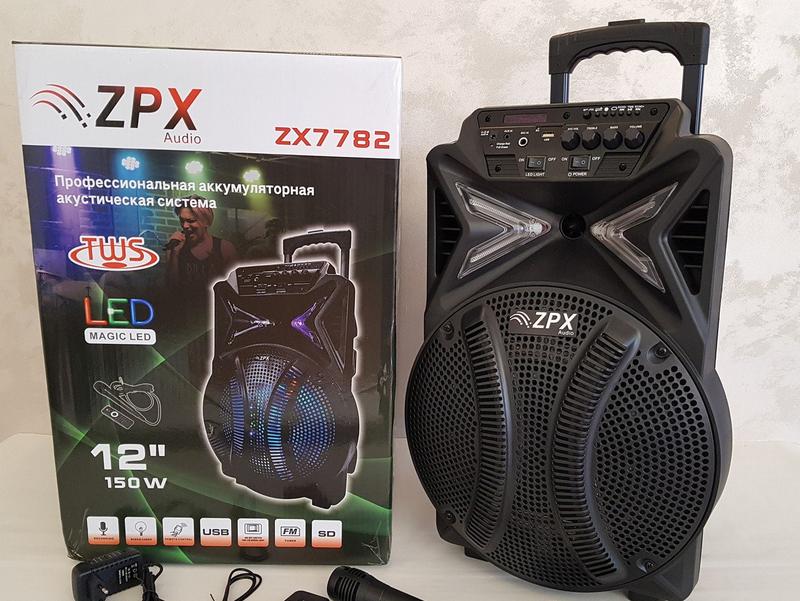 ВНИМАНИЕ! Этот товар отправляется только Новой Почтой! Функциональная колонка ZPX 7782 с проводным микрофоном (USB/BT/FM). Акустика имеет встроенный аккумулятор, что делает колонку полностью автономной. Портативная колонка-комбоусилитель ZPX 7782 оснащена всеми современными функциями: Bluetooth, радиоприемник, mp3-плеер, который считывает информацию с карт памяти и флешек. В комплекте к колонке прилагается проводной микрофон. Все управление находится на передней панели, что очень удобно, если вы используете колонку как караоке систему. Управлять комбоусилителем можно не только с панели управления, но и с пульта дистанционного управления. Портативная колонка с FM-радио, USB, SD, Bluetooth, проводным микрофоном и пультом дистанционного управления, ZPX 7782 , является идеальным аксессуаром для пикника, презентаций, вечеринок для детей, дней рождения или вечеринок и уличных мероприятий. Характеристики акустики: - Номинальная мощность: 100 Вт - Пиковая мощность RMS: 150 Вт - Сопротивление: 4 Ом - Есть вход по акустическую стойку - Функция Bluetooth - Функция TWS - можно соединить по bluetooth несколько колонок одновременно!!! - Есть LED подсветка - можно ВКЛ или ВЫКЛ Динамики: - Динамик Низких Частот - 1х12 " (дюйма) - Динамик Высоких Частот - 1х 2" (дюйма) Общие характеристики: - Частота: 50 Гц - 20 кГц - Чувствительность: 95 +/- 3 дБ - FM-радио : Да - Bluetooth: Да - USB вход: Да - SD card вход: Да - FM радио: Да (88-108 mHz) - Микрофон шнуровой: 1 шт - Напряжение питания: 110-240V - Встроенный аккумулятор: 7,4 вольт 1,8 Ампер - Размер колонки: 36х26х56 см - Размеры упаковки: 38х38.5х58 см - Вес: 6кг Питание акустики: 1. От встроенного аккумулятора. 2. От розетки (сеть 220 V). Регулировки управления громкости акустики: - Управление громкости акустики: 1. Общая регулировка громкости акустики. 2. BASS - управление низких частот громкости. 3. TREBLE - управление высоких частот акустики. - Управление громкости микрофонов: 1. Общая регулировка громкости микрофонов. 2. Регулировка ECHO для микрофона. 3. Функция MICROPHONE PRIORITY (когда вы говорите в микрофон ― звучание музики затухает) Входа для подключения: - USB вход. - SD/MMC Card вход. - Аудио вход Jack 3.5 - для подключения телефона-ноутбука-планшета и других устройств. - Микрофонный вход: 1 шт х Jack 6.3". Функции: - USB - Bluetooth - SD Card - LED подсветка (можно ВКЛ/ВЫКЛ) - КАРАОКЕ - FM Радио - Функция TWS - можно соединить по bluetooth несколько колонок одновременно!!! Комплектация акустики ZPX Audio 7782: 1. Акустика ZPX Audio 7782. 2. Микрофон шнуровой - 1 шт. 3. Пульт управления - 1 шт. 4. Шнур питания и зарядки. 5. Инструкция. 6. Упаковка.