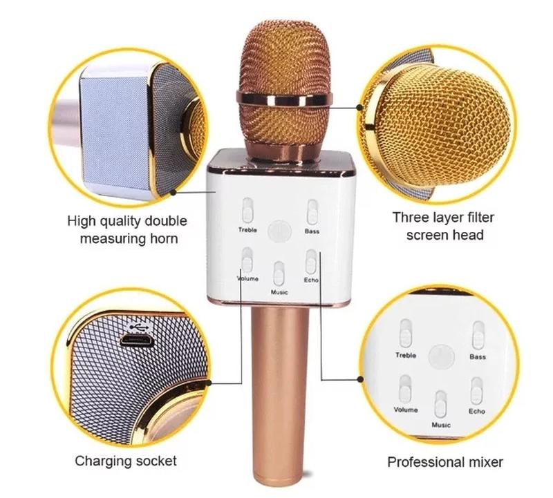 Бездротовий караоке мікрофон Q7 Золота Троянда Мікрофон Q7 у зручному жорсткому чохлі на замку. Працює у трьох напрямках: мікрофон, караоке, плеєр Бездротовий караоке мікрофон Q7 Потужний акумулятор, вбудовані стовпчики, бездротовий зв'язок зі смартфоном… Кількість позитивних якостей Q7 можна перераховувати дуже довго! Головне - тепер ви зможете облаштувати домашнє караоке на найвищому рівні та подарувати собі свято вдома у будь-який час! Технічні характеристики 1. Модель: Q7 2. Потужність: 6 Вт 3. Підтримка: Bluetooth 4.1 4. Батарея: 2200 мАч літієво-полімерного складу 5. Режими: Bass, Treble, Echo, Music, Volume 6. Відтворення частот: від 100 герц до 10 кілогерц 7. Час роботи без 8. під5 корпуса: метал 9. Напруга блоку живлення: 5 вольт 10. Сумісність з ОС: Android, Apple 11. Роз'єми: USB, мікро USB, Jack5 для навушників 12. Вага: 394 грама Комплектація: 1. Мікрофон Q7 2. Кабель мікро USB 3. Коробка
