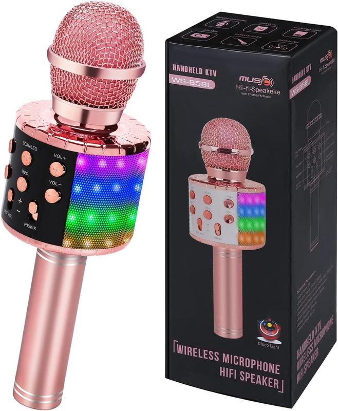 Уценка (поврежденная картонная упаковка, сам микрофон и комплектующие не повреждены) Об этом товаре - ♪【Микрофон для караоке 4-в-1】-Портативный ручной беспроводной микрофон можно использовать в качестве микрофона, Bluetooth-динамика, динамика, записывающего устройства. Отличный мини-КТВ для дома, чтобы играть и петь в любое время. Отличные игрушки для девочек 6-8 лет, девочек 6-7 лет, девочек 4-5 лет, игрушки для девочек 8-10 лет - ♪【Мощное качество звука и забавная смена голоса】 Профессиональный аудиопроцессор и система настройки, три слоя высокого шумоподавления, создают потрясающую живую звуковую среду KTV и прекрасную эхо-реверберацию. Измените свой голос с помощью 5 различных эффектов, подарите своим детям гораздо больше удовольствия. - ПРОЧНАЯ И БЕЗОПАСНАЯ КОНСТРУКЦИЯ: Bluetooth-микрофон для караоке для детей изготовлен из прочного алюминиевого сплава, который выдерживает падения, удары и падения. Специально используйте аккумулятор, сертифицированный UL, чтобы обеспечить безопасность детей при зарядке и использовании. Детский микрофон также сертифицирован в соответствии с официальными стандартами США по безопасности игрушек CPC. Это не вредно для ваших мальчиков, девочек, детей. Отличная игрушка для девочек 8-10 лет. - ♪【Трехстороннее подключение и динамическая светодиодная подсветка】- Встроенные управляемые цветные светодиодные лампы, мерцающие под музыку и ваше пение, создают живую среду и делают ваше пение более интересным. Вы можете подключить детский микрофон к смартфону с помощью кабеля, Bluetooth или TF-карты. Обеспечьте вам максимальный комфорт и позвольте вам наслаждаться пением. - ♪ 【Идеальный подарок для детей и взрослых】-Беспроводной bluetooth-караоке-микрофон легко держать, он подходит для детей старше 3 лет и взрослых, отличный подарок на день рождения или Рождество для 3, 4, 5, 6, 7, 8, 9, 10 лет, девочек, мальчиков, подростков. * * * Информация о товаре Bluetooth караоке-микрофон для детей и взрослых - лучшие подарки игрушки для девочек и мальчиков Bluetooth-микрофон для караоке с динамической светодиодной подсветкой - Модернизированный с красочной динамической светодиодной подсветкой, вспышкой с изменением музыки во время пения. Создает для вас опыт младшей рок-звезды. - Микрофон для девочек-игрушек для детей изготовлен из прочного алюминиевого сплава, который выдерживает падения, удары и аварии. - Позвольте вашим детям выражать себя через музыку и делиться своими выступлениями, чтобы повысить уверенность в себе и коммуникативные навыки, что важно делать в юном возрасте. - Микрофон для игрушек для девочек оснащен аккумуляторной батареей, сертифицированной UL, для обеспечения безопасности детей во время зарядки и использования. Детский караоке-микрофон соответствует официальным стандартам США по безопасности игрушек CPC. Это сверхбезопасный караоке-микрофон для детей. - Стильный дизайн и яркий цвет делают его идеальным подарком на день рождения девочки на 4, 5, 6, 7, 8, 9, 10 лет или рождественским подарком для детей. Как записать? - Подключитесь к телефону, iPad или компьютеру с помощью Bluetooth или кабеля. Функция Bluetooth должна быть отключена, проводной режим - Откройте программное обеспечение для караоке с функцией записи на мобильном телефоне, запишите песню в соответствии с инструкциями программного обеспечения для караоке, затем выберите свою лю