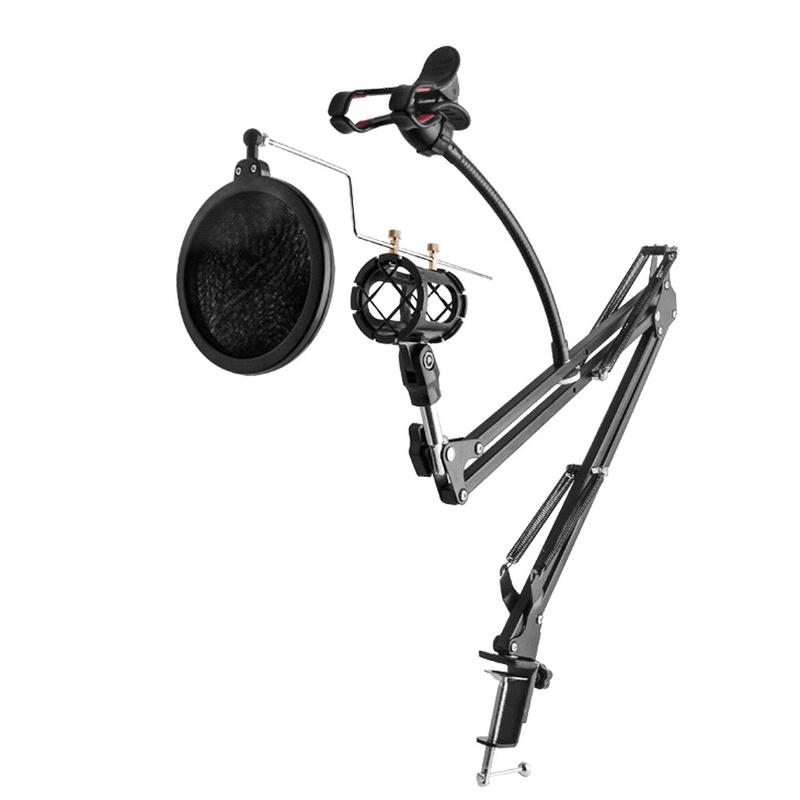 Мобильная студия Remax CK-100 состоит из настольного держателя, крепления для микрофона , и телефона, сам микрофон приобретается отдельно. держатель для устройства диаметром до 7.9 дюймов; макс. 6 см основание замка; круглое отверстие 40 мм; материал: металл, пластик; длина 95 см; свободно вращается на 360 градусов.