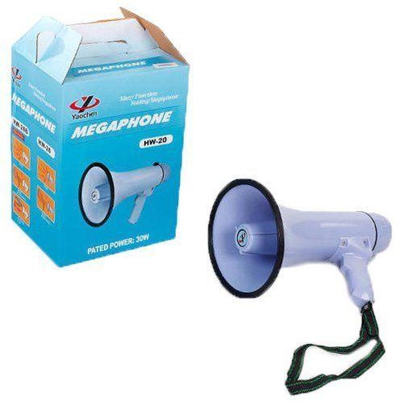 Громкоговоритель HW-20B-A - надежный простой мегафон с широким частотным диапазоном, что гарантирует высокое качество передачи усиленного звука Если вам часто приходится общаться с большой группой людей – воспитанниками вашей спортивной секции или группами туристов, то вы знаете как это утомительно для горла. Помочь вам может громкоговоритель Громкоговоритель предназначен для проведения тренировок или спортивных состязаний, сопровождения экскурсий, организации общественных мероприятий. Он позволяет отдавать команды или доносить информацию до большой группы людей на улице или в помещении без использования стационарных источников питания. Благодаря использованию новейших технологий он способен создать значительное акустическое давление, которое способствует распространению звука на значительное расстояние. Это надёжный мегафон с возможностью передачи звука на расстояние 500 метров и более. Представляет собой конус с жёстко прикреплённой рукоятью, изготовленный из устойчивого к ударам пластика. Качество материала и надёжная конструкция позволяют эксплуатировать его в любую погоду на протяжении 7 часов. Энергопитание осуществляется от батареек типа 6С. Основная часть электроники смонтирована в крышке на торце громкоговорителя. Она легко открывается, что позволяет быстро заменить энергопитание. Также на крышке смонтирована панель управления – кнопки включить/выключить, записи и воспроизведения звуков, регулировка громкости. Преимущества громкоговорителя рупорного: Качественный пластиковый корпус устойчивый к ударам и атмосферным воздействиям. Подходит для спортивных мероприятий, публичных выступлений, групповых занятий как в помещении, так и на улице. Удобная, сбалансированная пистолетная рукоятка с прочным ремнём для переноски. Материал: пластик. Диаметр: 19,5 см. Длина: 32,3 см. Номинальная шумовая мощность: 30W. Звуковой диапазон: свыше 500м. Дополнительные функции: запись, USB. Назначение: для использования на открытых площадках и в помещении.