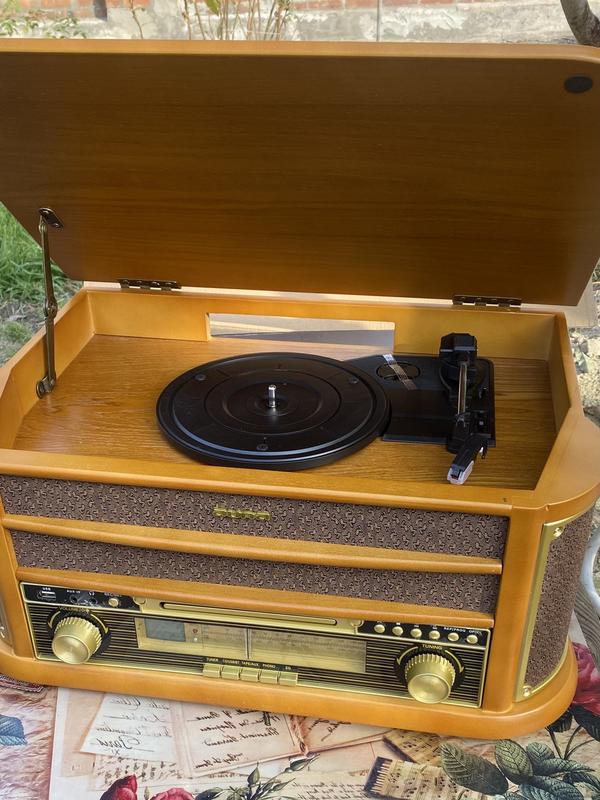 Основные возможности: - ностальгическая стереосистема с радиотюнером FM/MW, стереодинамиками и функцией записи - Интерфейс Bluetooth для воспроизведения музыки со смартфона, планшета или компьютера. - Проигрыватель проигрывателей Phono с ременным приводом и автоматической системой старт-стоп - USB -- для подключения USB-накопителей и MP3-плееров с поддержкой MP3. - MC -- встроенная кассетная дека для воспроизведения аудиокассет - Стильный: корпус из массива дерева, тканевая крышка динамика и золотой декор. Характеристики: - Подключения: 1 интерфейс USB - Совместимые аудиоформаты: mp3. - Совместимые типы дисков: CD, CD-R, CD-RW. - Функция записи - Контроль громкости - Регулятор частоты - Масштаб полосы частот - Индикатор питания - FM-стерео светодиодный - ЖК дисплей - Проволочная антенна - Переключатель включения/выключения на задней панели устройства - Электропитание: 100-240 В, 50/60 Гц. Объем поставки: - 1 х ретро-микросистема - многоязычная инструкция по эксплуатации Размеры: - 50 х 22 х 33 см (ШxВxГ) - Вес: около 8 кг