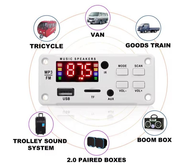 Поддержка форматов песен MP3/WAV/WMA Режими: USB / TF / FM / LINE IN / BLUETOOTH 5.0 Встроенный усилитель 50 Вт: 2 х 25 Вт (стерео, мощность реальная) Питание: 11-16В Размер: 92 х 41 мм Комплектация: Аудиоплеер Пульт ДК Набор кабелей