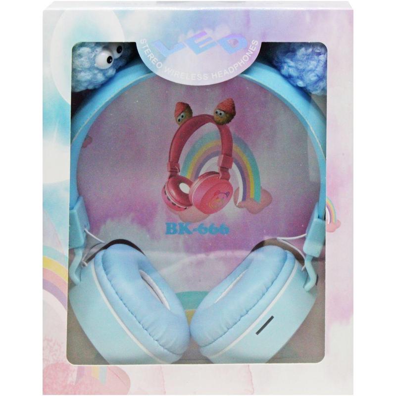 Беcпроводные наушники в оригинальном дизайне. Дуга наушников украшена забавными мягкими чудиками. Мягкие подушечки на наушниках гарантируют комфортное ношение и звукоизоляцию. Высота регулируется, подойдут как взрослому, так и ребенку. Компактно складываются. На наушниках есть кнопки для регулировки громкости, остановки музыки и выключения наушников. Есть разъем для карты памяти и микрофон. Подойдут ко всем моделям смартфонов и ноутбуков с поддержкой Bluetooth. После полной зарядки работают 4 часа. В наборе есть USB- кабель для зарядки. Бренд: MIC Упаковка: Коробка Цвет: Голубой Вес в упаковке: 210 г Габариты в упаковке: 7.5 x 16.5 x 20.5 см Габариты без упаковки: 6 x 15 x 19 см Cтрана производитель: Китай Материал: Комбинированный Комплектация: Наушники, USB-кабель для зарядки