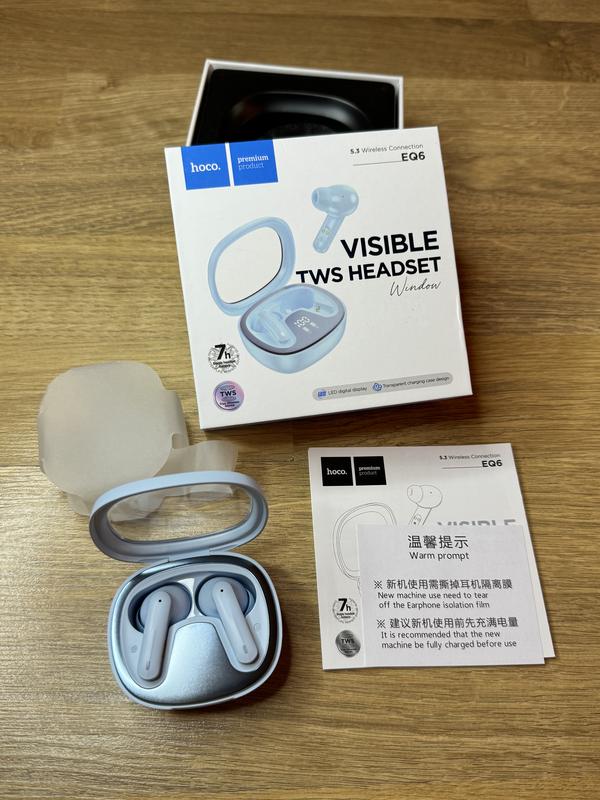 Нові навушники, ні разу не були в експлуатації. Опис Бездротові TWS навушники Hoco EQ6 Shadow - це передовий пристрій для бездротового прослуховування музики та здійснення дзвінків. Завдяки високоякісному звукові і зручності при експлуатації, вони стануть ідеальним вибором для активного способу життя. Технічні характеристики Діапазон частот: 20-20000 Гц Версія Bluetooth: V5.3 Профіль передачі аудіо A2DP гарантує якісний звук під час відтворення музики. Розмір динаміка 13 мм забезпечує глибокий та насичений звук з хорошою деталізацією. Дальність передачі 10 метрів Ємність акумулятора 320mAh забезпечує до 7 годин роботи в режимі відтворення або розмови і до 35 годин у режимі очікування. Час зарядки 1,5 години Напруга заряджання DC 5V Кейс може підзарядити навушники 4 рази, що дозволяє тривалий час використовувати навушники без необхідності підключення до джерела живлення. Розмір продукту 62x53x28,5 ммВага 47 г Функції Легко керуйте відтворенням музики, призупиняйте відтворення або переходьте до наступного треку простими дотиками. Активація голосового помічника. Зручно користуйтесь голосовими командами для керування пристроями без рук. Інтелектуальний цифровий дисплей дозволяє легко перевіряти статус заряду навушників та їх кейсу. Набір амбушур різних розмірів (XS/M/XL) дозволяє підібрати розмір, який забезпечить максимальний комфорт під час носіння навушників. Ідеально підходять для прослуховування улюбленої музики без втрат в якості звуку. Комплектація: Бездротові навушники, кейс, амбушури XS/M/XL, кабель USB-C, посібник з експлуатації.