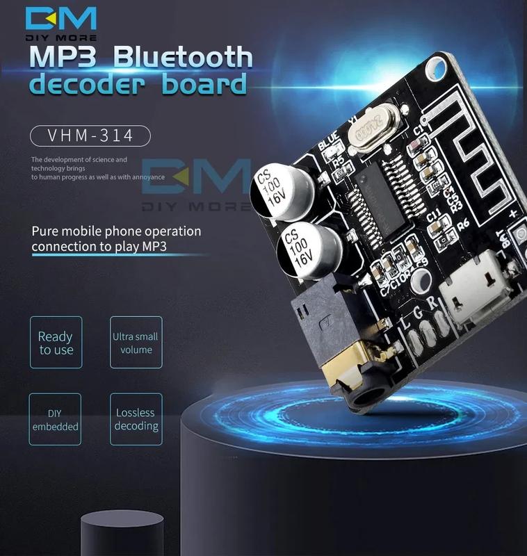 Используемый чип видно на фото, кому интересно. Характеристики: Вхідний струм 20мА Напруга живлення 3.7В / 5В Підтримувані протоколи A2DP/AVCTP/AVDTP/HFP Розміри 30х30 мм. Характеристики XY-BT-Mini VHM-314 Bluetooth стерео аудіо модуль - використовується для прийому аудіо сигналу, за допомогою протоколу Bluetooth версії 5,0. Підтримує декодування WAV+APE+FLAC+MP3 без втрат, має стереовиход. Дуже простий у використанні - необхідно підключити до телефону, подати напругу на модуль ( 3,7-5 В) , та підключити навушники. Дальність стійкого прийому сигналу становить до 15 метрів прямої видимості. Навушники підключаються через стандартний штекер 3,5 мм. Коли Bluetooth підключено, синій індикатор світиться. В сети Bluetooth плата идентифицируется под именем VHM-314, сопрягается без пароля. События включения, сопряжения с источником и отключения от него сопровождаются довольно приятными мелодиями из трех нот. На плате имеется красный светодиод, подписанный как BLUE;). При поиске устройства светодиод моргает с частотой 2 раза в секунду, после сопряжения — 1 раз в 5 секунд. В работе плата не греется. После отключения зарядника от розетки устройство работает порядка 3 секунд, т.е. потребляемый ток невелик. Чувствительность устройства хорошая, работает даже при удалении смартфона в другую комнату в железобетонной девятиэтажке с толщиной панели 16см. Звук стерео, к выходу можно подключать не только усилитель, но и наушники. Если подключаете гарнитуру с 4-контактным разъемом, оставляйте миллиметровый зазор между штеккером и гнездом. Если вставить штеккер гарнитуры до упора — пропадут басы. С трехконтактным штекером «просто наушников» такой проблемы разумеется нет. Фоновые шумы и наводки на наушниках не слышны вообще. На паузе удалось услышать наводки только подойдя вплотную к колонке подключенной к ресиверу мощностью 60Вт. Громкость при этом была выкручена на максимум. Пром оплата работает.