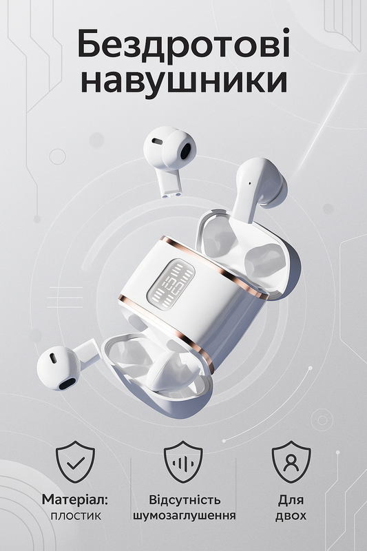Беспроводные Bluetooth наушники с кейсом и LED-дисплеем – стильные и удобные наушники для музыки, звонков и игр. Компактный зарядный кейс с цифровым индикатором уровня заряда, современный дизайн в белом цвете с золотистыми вставками. Эргономичная форма, сенсорное управление, встроенный микрофон, поддержка шумопоглощения и стабильное соединение по Bluetooth 5.0. В комплекте – две пары наушников в одном кейсе, что удобно для совместного использования или в качестве запасного варианта. Подходят для смартфонов, планшетов, ноутбуков, Android и iOS. Идеально для спорта, прогулок, путешествий и ежедневного использования. беспроводные наушники, Bluetooth наушники, наушники с кейсом, наушники с LED-дисплеем, наушники с микрофоном, спортивные наушники, наушники для телефона, наушники для игр, стильные наушники, белые наушники, TWS наушники, наушники с шумоподавлением, двойные наушники, две пары наушников. Беспроводные Bluetooth TWS наушники с LED-дисплеем, микрофоном, шумоподавлением и кейсом на две пары