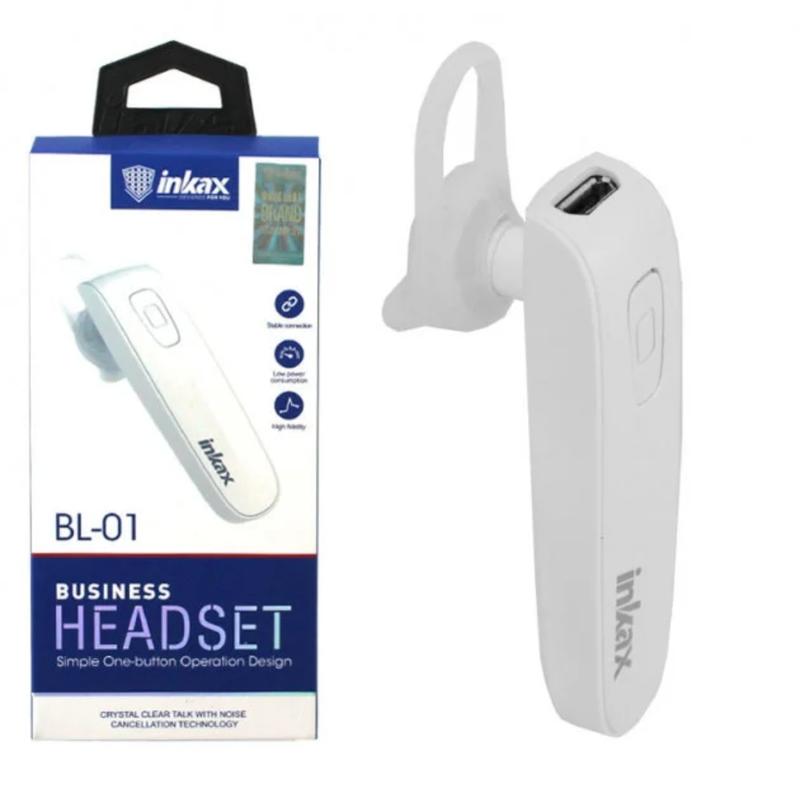 Вluetooth Гарнитура INKAX Блютуз гарнитура INKAX BL-01 - гарнитура поможет вам эффективно осуществлять звонки, не отрываясь от выполнения дел в вашем насыщенном графике. Батарея устройства обеспечивает время работы в режиме разговора до 3-4 часов. Гарнитура удобно садится в ушной раковине и не выпадает, благодаря дополнительной фиксации гарнитуры в виде дужки. Функция bluetooth осуществляет возможность подключения до двух устройств. В комплект гарнитуры входит кабель зарядки, заряд устройства составляет до 2 часов