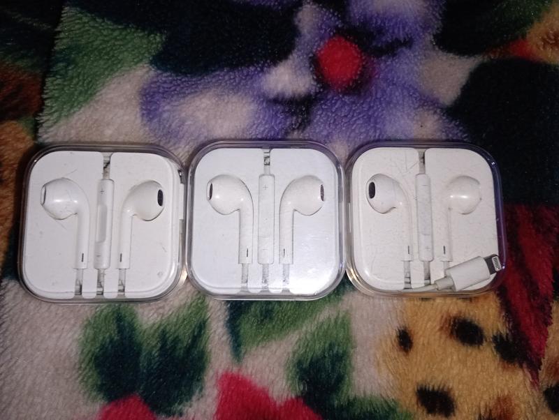 Три пары наушников к Iphone. Две пары имеют стандартный разъем Apple, одна имеет разъем 3.5мм. Наушники в хорошем состоянии, хороший звук. То что нужно.