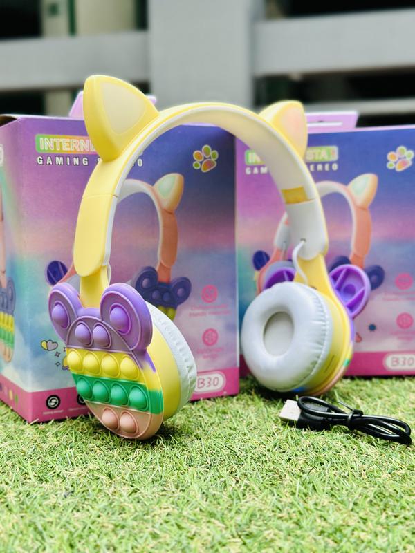 Ці барвисті навушники з котячими вушками — справжній фаворит серед малечі! Вони вдало поєднують оригінальний дизайн і зручність у використанні, а яскраве оформлення й креативні деталі зроблять їх стильним доповненням до повсякденного образу. Навушники зручні, легкі та функціональні — ідеально підходять для прослуховування музики, ігор, навчання чи спілкування. Особливості: - цікавий дизайн з вушками; - бездротове з’єднання з пристроєм; - час роботи в режимі розмови: 6 годин; - час зарядки: 2 години; - час очікування: 18 годин; - функція FM-радіо; - підсвічування; - AUX-роз’єм (кабель не додано до комплекту); - технологія шумозаглушення; - дистанція до 10 м; - кабель для зарядки у комплекті; - для перемикання треків і збільшення/зменшення гучності на навушниках розташовані кнопки управління. Матеріал : Виробник : -