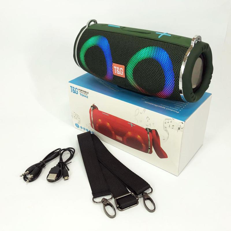Портативная колонка TG642 с RGB подсветкой и ремешком - Bluetooth 5.0: быстрое подключение и стабильный сигнал, совместим со всеми устройствами Bluetooth. - Аккумулятор 1200 мАч: до 10 часов воспроизведения на средней громкости (2/3) при полной зарядке. Сетчатая крышка: защищает динамик от воды, пыли и ударов. - Высокая мощность 5 Вт * 2: два низкочастотных динамика с каждой стороны, вибрируют во время воспроизведения музыки. 360-градусный стереозвук: цилиндрическая форма и встроенные левый и правый каналы. - Функция звонка: встроенный микрофон с шумоподавлением позволяет отвечать на звонки, не касаясь телефона. - Функция TWS: возможность синхронизации двух динамиков с одним телефоном. - Поддержка USB-флеш-накопителя: воспроизведение музыки с флешки. - Поддержка карт TF или microSD емкостью до 32 ГБ, поддержка USB 2.0. - Поддержка внешнего входа AUX: подключение MP3/MP4 плееров, компьютеров и других аудиоустройств. - Управление кнопками: включение/выключение, воспроизведение/пауза, переключение режима, переключение песен, регулировка громкости и т.д. - Многофункциональность: не только Bluetooth-динамик, но и радио, проводной динамик, портативная колонка с мощным басом. Характеристики: - Версия Bluetooth: 5.0 - Диапазон: 10 м - Отношение сигнал/шум: ≥ 95 дБ - Емкость аккумулятора: 1200 мАч - Встроенное напряжение: 3,7 В - Время воспроизведения: 10 часов (на средней громкости) - Динамик: φ57 мм x 2 - Мощность динамика: 4 Ом / 5 Вт x 2 - Частота: 120 Гц - 20 кГц - Размеры: 223 x 96 x 105 мм - Вес: 750 г Комплектация: - Bluetooth-динамик x 1 - USB-кабель для зарядки x 1 - Аудиокабель AUX x 1 - Плечевой ремень x 1 - Руководство пользователя x 1