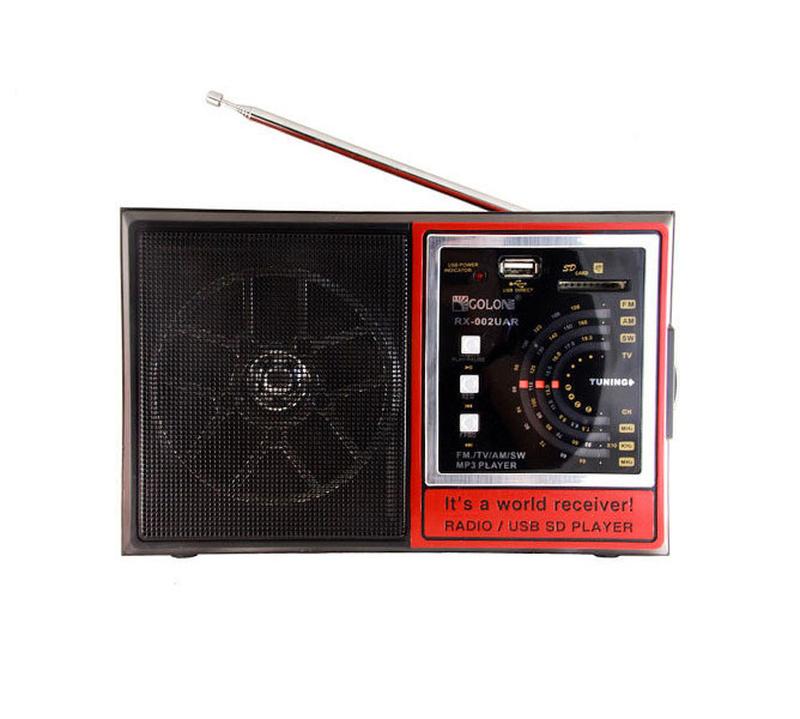Радиоприемник GOLON RX-002 /USB+SD Радиоприемник GOLON RX-002 с высокой чувствительностью, хорошо подходит для зон с неуверенным приемом. Динамик с хорошим звучанием. Благодаря мощному встроенному аккумулятору долгое время, вы сможете слушать любимую музыку c USB флешки, карты памяти SD, очень мощный FM приемник , превосходное качество приема, даже в отдаленных местах, корпус из пластика, есть ручка для переноса, легко носить с собой. В радиоприемнике GOLON RX-002 предусмотрено несколько источников питания: кроме встроенного аккумулятора это может быть сеть 220 В, или четыре батарейки UM-1. Станет хорошим сопровождением на даче или просто в доме. Может быть востребованным приобретением для старшего поколения. В комплекте поставляется удобный ремешок. Характеристики: FM диапазон: 64 - 108 МГц; TV диапазон: 2 - 5 канал; AM диапазон: 530 - 1600 КГц; SW диапазон: 7.5 - 19.0 МГц; Антенна: телескопическая Поддержка носителей информации: USB, SD; Поддерживаемые аудиоформаты: MP3, WMA, WAV; Выход на наушники: 3.5 мм Комплектация: Радиоприемник GOLON RX-002 Ремешок Коробка