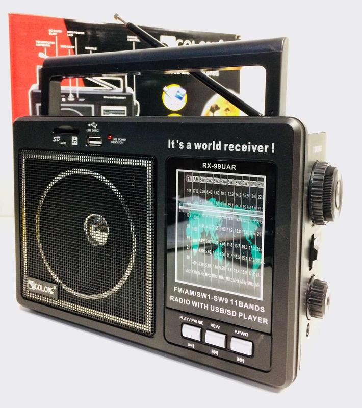 Портативний радіоприймач, має вбудований акумулятор, завдяки йому, ви зможете слухати улюблену музику з USB флешки, карти пам'яті SD, FM радіо, на дачі, на відпочинку, далеко від розетки, на дисплеї відображається FM частота, номер треку, корпус із пластику, легко носити з собою, 3 варіанти живлення: вбудований акумулятор (до 8 годин), батарейки R20 4шт, від мережі 220В (шнур у комплекті), від нього з заряджається вбудований акумулятор. Характеристика: Автосканування FM-радіостанцій. Частотні діапазони: FM: 87,5-108 МГц. Запам'ятовує радіостанції. Цифровий екран. Аудіо-вихід, аудіо-вхід. Висока чутливість. Живлення: акумулятор 6V (вбудований). Заряджається від мережі 220v MP3 плеєр - USB/SDcard вхід (підтримує USB флешку та карту пам'яті). Підтримка форматів MP3/WAW/WMA Лінійний вхід можна використовувати як колонку для ПК, телефону, або для плеєра. Два стерео динаміки. Вихідна потужність – 6W (3W+3W). Розміри (В/Г/Д) 120х65х150 мм Комплектація: Радіоприймач Шнур для підключення до мережі 220В Ремінь для перенесення