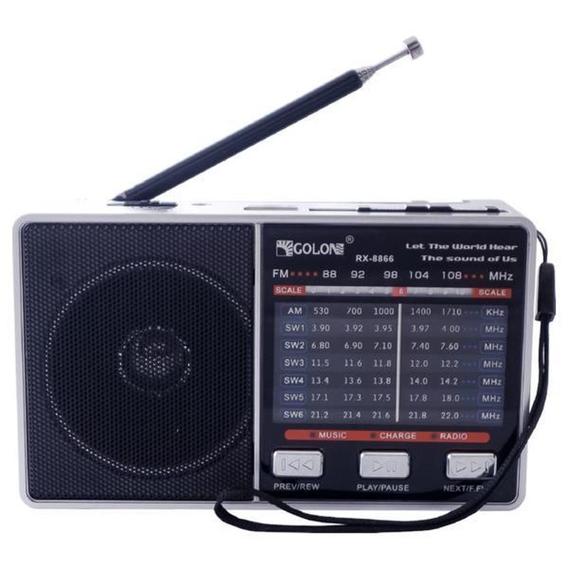 Портативний динамік / радіо / колонка Golon RX8866BT (8868) – дозволить слухати улюблену музику з будь-якого носія: c USB флешки, карти пам'яті SD або станції FM радіо. Ця модель приймача має чудову якість прийому, навіть у віддалених місцях. Широкий крок між радіостанціями, легко налаштуватися на ту чи іншу частоту Портативна фм колонка не велика, її легко носити із собою, також є потужний LED ліхтарик 1W. Працює від акумулятора або універсального USB адаптера 220В (не входить в комплект). Переваги: Компактні розміри: зручно носити із собою; Робота від акумулятора; Просто у використанні – інтуїтивно зрозуміле управління. Характеристики: Частотний діапазон: FM 88 – 108 МГц, SW 3,4 – 23 МГц, AM 530 – 1600 КГц; Відтворення MP3 з microSD TF та USB карт пам'яті; Розмір: 130х80х40 мм; Робота від акумулятора BL-5C; Робота від зовнішнього джерела живлення 5V; Робота від 3-х батарей 1,5V, типу АА; Можливість зарядки та роботи від сонячної батареї 6V; Потужність ліхтарика LED 1W; Робота від батарейок 1 шт.
