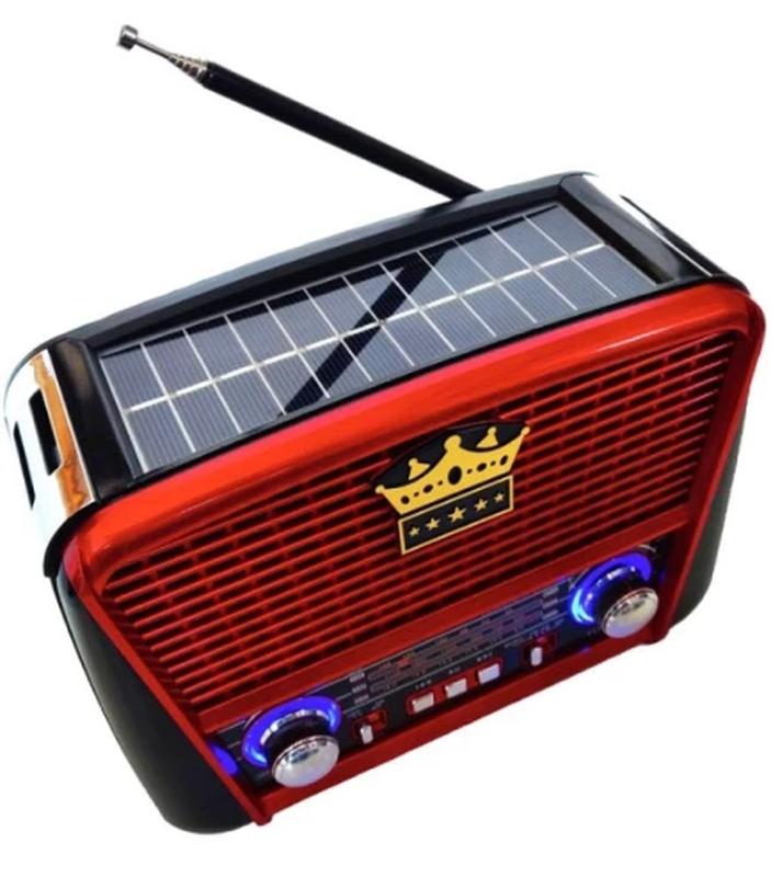 Портативный радиоприёмник-колонка Golon RX-455S Solar -- 3-диапазонный радиоприёмник с фонариком и аналоговым тюнером, работающий на волнах FM, AM и SW. Воспроизводит MP3-файлы с USB-флешек и карт памяти microSD, может работать как power bank. В комплекте ремень через плечо. Внешний вид стилизован под ретро-радиолу 50-х годов. Работает от встроенного аккумулятора, который можно заряжать: - от сети 220V, - от адаптера 6V 1A (не входит в комплект), - от солнечных панелей, встроенных в верхнюю часть приёмника. На солнце RX-455S постоянно заряжает аккумулятор, время полной зарядки около 10 часов. Радиоприёмник также может использоваться как павербанк -- на боковой панели есть выход DC 4V (5,5/2,1 мм). Приёмник воспроизводит музыку через 1 динамик и принимает диапазоны: - FM: 88-108 МГц - AM: 530-1710 кГц - SW: 9-16 МГц Также может работать от двух батареек 1,5V типа UM-1 (К20/D). Характеристики Golon RX-455S: - Поддержка microSD и USB для воспроизведения MP3 - Радио с аналоговым тюнером - Выдвижная антенна - Съёмная лямка на плечо - Солнечная панель - Встроенный LED фонарик - Встроенный аккумулятор - Зарядка от сети: 110-220V, 50/60Hz или DC 6V - Питание: встроенный аккумулятор или 2 батарейки 1,5V типа UM-1 (не входят в комплект) - Выход питания (power bank): 4V - Количество динамиков: 1 - Материал корпуса: пластик - Вес (без батареек): 0,85 кг - Размеры: 21 × 15 × 9 см