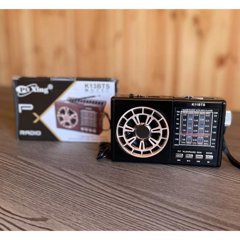 Современный радиоприемник Радио K11BTS внешне довольно похож на приемника, распространенные десятки лет назад. На внешности сходство заканчивается, ведь начинка этого радио вполне современная. Радиоприемник имеет разъемы, с помощью которых вы можете проиграть любимые композиции из карт памяти SD и USB флешек. Кроме этого, приемник работает от солнечной батареи, что является достаточно актуальным в наше время. Характеристики: AM/FM/SW1-5 7-диапазонное радио Разъем: USB/TF Аккумуляторная батарея (18650) Внешний DC 5V в разъем для зарядки Солнечная панель: 6 В 0,8 Вт С функцией BLUETOOTH (5.2) Светодиодная подсветка Размер: 161×56×98 мм Радио K11BTS