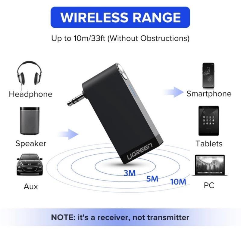 Кілька примірників у наявності Аудіоприймач Ugreen з мікрофоном призначений для приймання музики з ПК, iPhone, iPad або MP3-плеєра до автомобільної стереосистеми, домашнього музичного центру, навушників, акустичної системи та інших різних систем із 3.5 мм стереовиходом. Цей приймач перетворює ваші звичайні динаміки на бездротові з Bluetooth. Використовуйте вбудований мікрофон для спілкування телефоном, коли Ви за кермом. Це бездротовий Bluetooth стереоприймач із мікрофоном Ugreen, який чудово підходить для трансляції музики з планшета, смартфона, iPhone, iPad або MP3-плеєра на автомобільну стереосистему, домашній музичний центр, акустичну систему та інші пристрої обладнані Aux (3.5 мм jack) стереовходом. Приймач Ugreen також обладнаний мікрофоном із системою заглушення шуму (DSR), що дає змогу використовувати пристрій для організації системи гучного зв'язку Hands Free у Вашому авто. Безпека за кермом, є пріоритетним завданням кожного водія. Виберіть Bluetooth стереоприймач Ugreen в онлайн-магазині ************** — слухайте улюблену музику без під'єднання додаткових дротів, не "попадайте" на штрафи за розмови телефоном під час руху та не відвертайте увагу на телефонні розмови за кермом! Особливості Версія Bluetooth: 4.1 Bluetooth-застосунки: Avrcp, A2DP, Hfp, HSP 3.5-мм стереоаудіовихід Підтримка гучного зв'язку Чутливість мікрофона: 38dB Час роботи в режимі розмови: до 5 годин Час роботи в режимі програвання музики: до 4 годин Діапазон відтворюваних частот: 20 Гц - 20 кГц SNR> 90dB Країна виробник: Китай Кількість каналів: 2.0 Колір корпусу: Чорний Стан: Новий