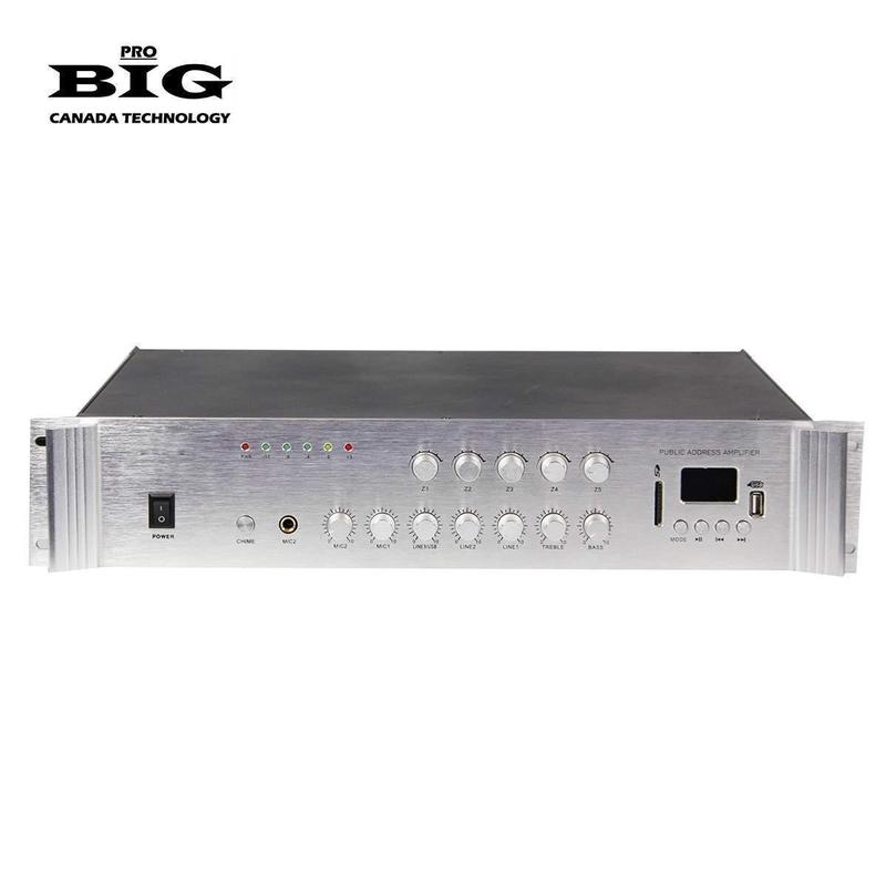 Виробництво - УГОРЩИНА Трансляційний цифровий підсилювач із імпульсним блоком живлення AB-класу (HIGH - END якість) Незаперечна якість на найвищому рівні Сучасний МП3 плеєр з ЖК дисплеєм, функцією BLUETOTH і FM приймачем Входи: 2mic+ 3stereo line in +МР3, SD Card-плеєр, FM тюнер П\'ять регульованих за гучністю зони (5-ти щаблів) Потужність(номінальна): 100W RMS Напруга на виході: 70V 100V або 4-16 ом (низькоомийний режим) 2-х (Bass, Treble) смугий еквалайзер Частотний діапазон: 20Hz-20KHz Пульт дистанційного керування