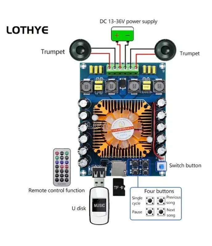Новий. В наявності. Пром оплата працює. Цифровий підсилювач звуку TDA7498E 2x160Вт Плата має роз'єм для microSD і USB-роз'єм для програвання музики. Пульт дистанційного керування для регулювання гучності та перемикання треків Модель продукту: XH-A123 Тип чипа: цифровий чип Модель чипа: TDA7498E Напруга живлення: DC12-24V Вихідний опір: 4-8Q Кількість каналів: два канали Вихідна потужність: 160 Вт*2 канала. Вага продукту: 188 г